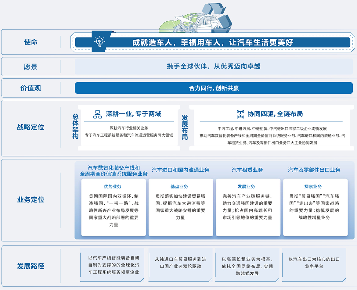 定位:是國機汽車貫徹國際國內(nèi)雙循環(huán)、制造強國、“一帶一路”倡議、綠色發(fā)展等國家重大戰(zhàn)略部署的重要力量;是貫徹推進戰(zhàn)略性新興產(chǎn)業(yè)布局發(fā)展、打造世界一流專業(yè)領軍企業(yè)、加快數(shù)智化轉型發(fā)展和高水平科技自立自強的重要力量。